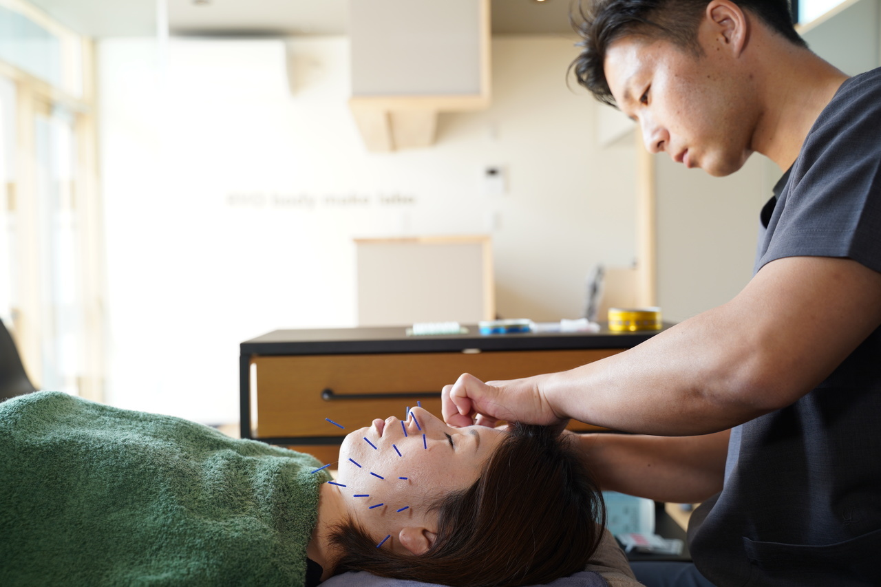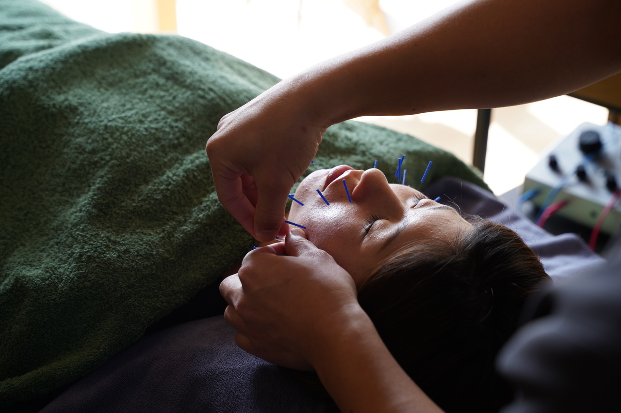 まずは鍼灸ボディケアで全身の緊張をゆるめて巡りを整え、その後フェイシャル美容鍼灸を行います。